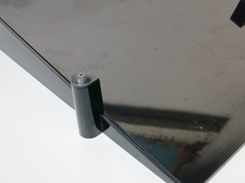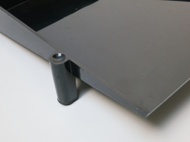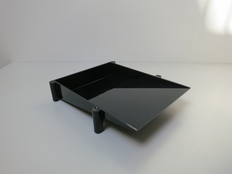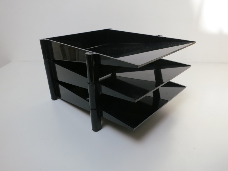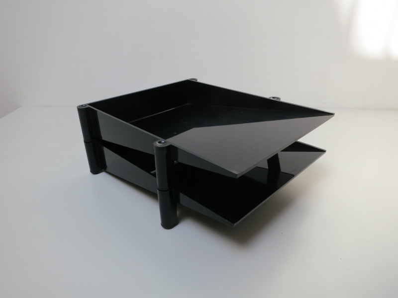 Stackable techno-polymer letter tray, with rubber feet, designed to organise A4 documents.