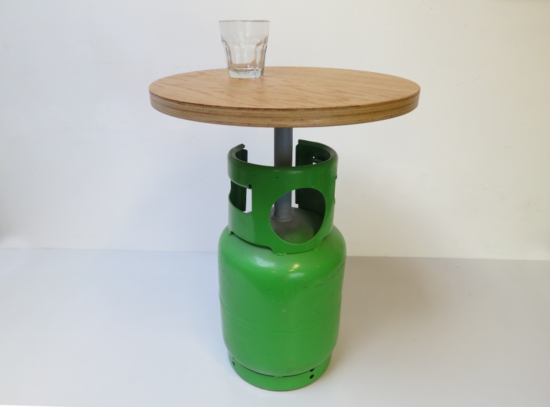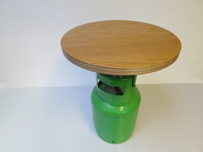 Side table made with discarded gas bottle & oak veneered birch ply top.